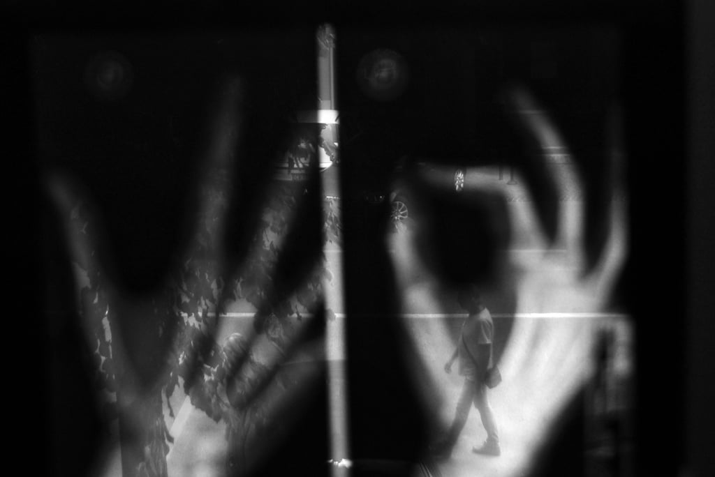 Un passant… Ouf, il y a de la vie ! Une pulsation : le passant marche, le passant passe… L’index droit bagué ou la jante d’une roue d’automobile ?